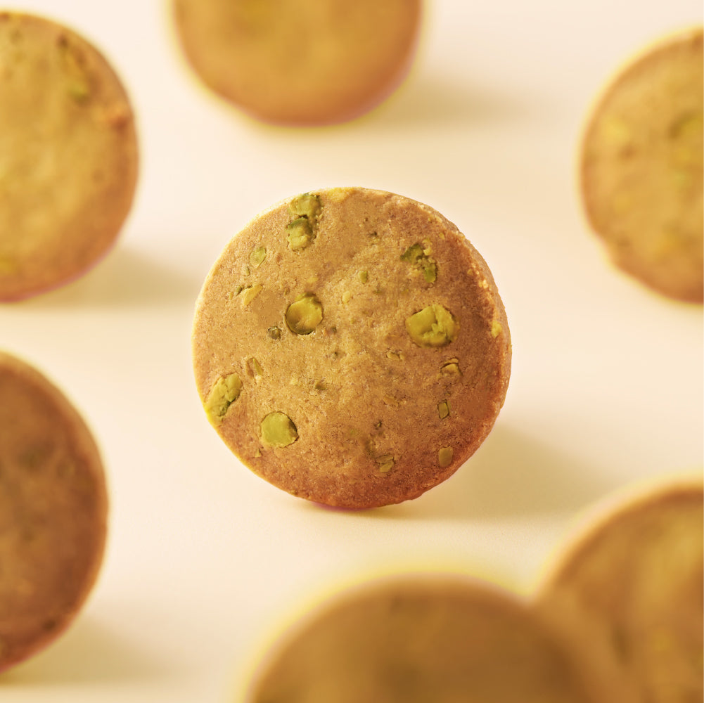 利用傳統法式沙布列混合方式製作,使餅身鬆化極致之餘,更提升義大利品牌開心果醬的柔滑及開心果香氣。