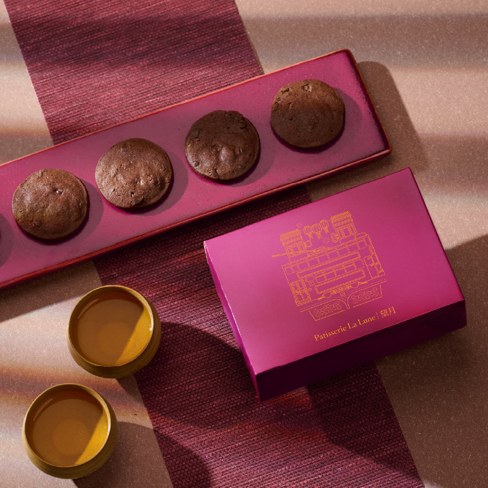 朱古力曲奇選用法國Extra Rouge可可粉,混入比利時黑巧克力豆。曲奇甘香鬆酥,黑巧克力豆卻像奶油般柔滑,突顯了可可堅果香氣以及巧克力特有的苦香,濃香誘人。